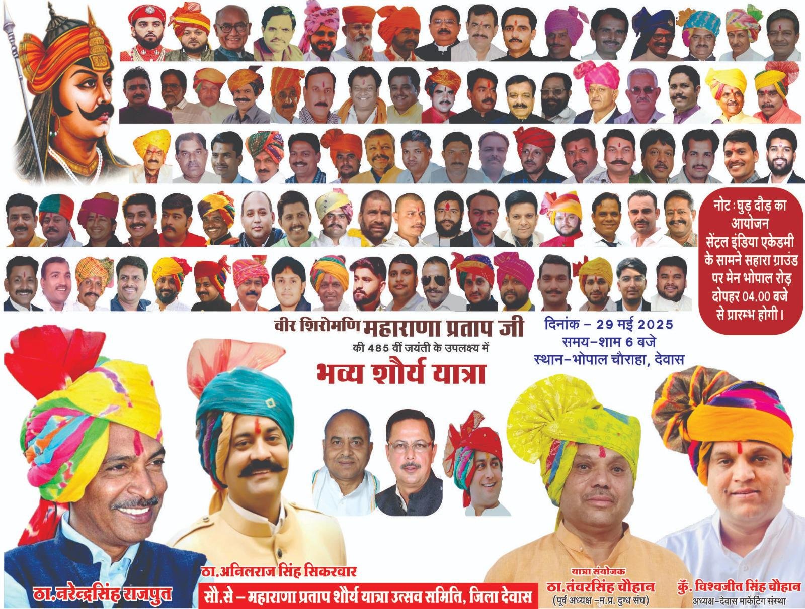 देवास। वीरता, आत्मगौरव और स्वाभिमान के प्रतीक महाराणा प्रताप की 485वीं जयंती के अवसर पर देवास शहर में इस वर्ष भी परंपरानुसार भव्य शौर्य यात्रा एवं सांस्कृतिक आयोजनों की श्रृंखला आयोजित की जा रही है। महाराणा प्रताप शौर्य यात्रा उत्सव समिति के तत्वावधान में 29 मई, गुरुवार को यह ऐतिहासिक यात्रा शाम 6:00 बजे शहर के प्रमुख चौराहे भोपाल चौराहा से प्रारंभ होगी, जो शहर के विभिन्न मार्गों से होती हुई प्रमुख स्थलों से गुजरेगी।